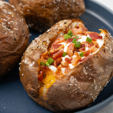 - favorite toppings (butter, shredded cheese, crispy bacon, green onions, chives, garlic powder, black pepper, sour cream)