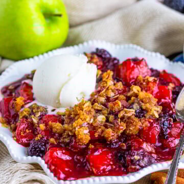 Picture tart granny smith apples mingling with juicy blackberries under a golden, crunchy crumble topping that smells like cinnamon heaven.