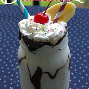 - Blend until smooth. Top with hot fudge, more whipped cream, sprinkles, cherry and piece of banana. Serve and enjoy!