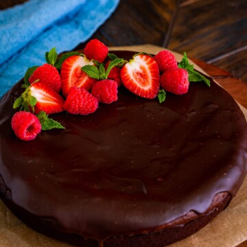 Naturally gluten-free, this Flourless Chocolate Cake Recipe is decadent and easy. Topped with chocolate ganache and fresh berries, it is the perfect anytime dessert.