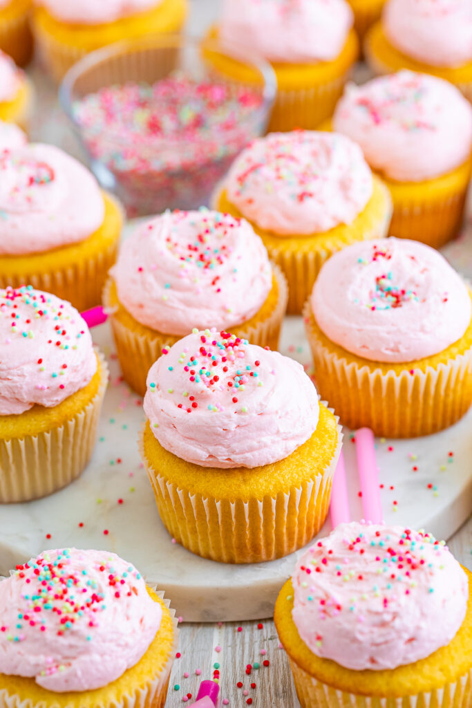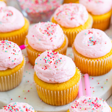 Whether it’s a birthday celebration or just a fun treat, these vanilla cupcakes with their classic vanilla buttercream and rainbow sprinkles are a total hit.