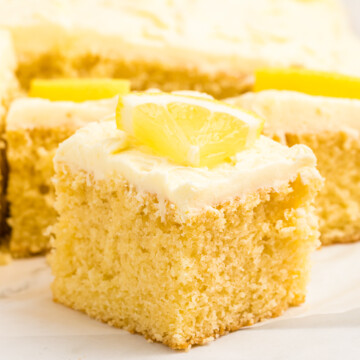 - Spread the lemon buttercream over the cooled sheet cake before serving.
