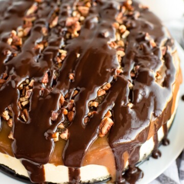 It’s like someone took the best parts of a turtle candy and transformed it into a cheesecake! The chocolate and caramel blend so well with the crunchy pecans and smooth cream cheese.