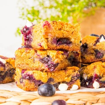 Blueberry White Chocolate Blondies are the chewy texture of your beloved blondie bars, enhanced with the luxurious taste of white chocolate flavor and punctuated by the juicy freshness of blueberries.