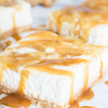 - Cut into 9 even bars, serve with caramel sauce of your choice. I recommend making my Cinnamon Buttermilk Caramel Sauce!
