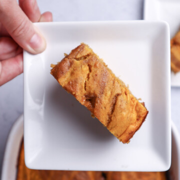 - Grease a 9×13” casserole dish. Pour ½ of the large bowl containing the pumpkin bread mixture inside. Then, add the entire bowl of pumpkin cream cheese, and cover with the remaining bread mixture.