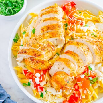 - For serving, add the savory pasta and chicken to a plate or bowl. Spoon the sauce over the top, and garnish with diced tomatoes, parsley, green onions, and shredded parmesan. Enjoy immediately.3 Roma tomatoes, 2 tablespoons fresh parsley leaves, 1 tablespoon green onions, Shredded parmesan