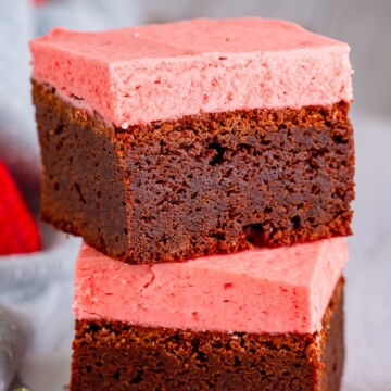 - Frost the top of the brownies with the strawberry buttercream, cut, and serve.