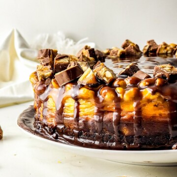 This decadent dessert has a crunchy Oreo crust, a creamy cheesecake filling packed with chopped Snickers bars, a gooey caramel peanut layer, and a rich chocolate ganache on top.