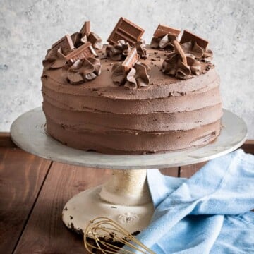 You can totally decorate this cake however you want, I added the little chocolate bars on top because I used Hershey’s special dark cocoa powder in the mix. Feel free to use whatever cocoa powder you prefer. This is just my favorite (and, not sponsored!).