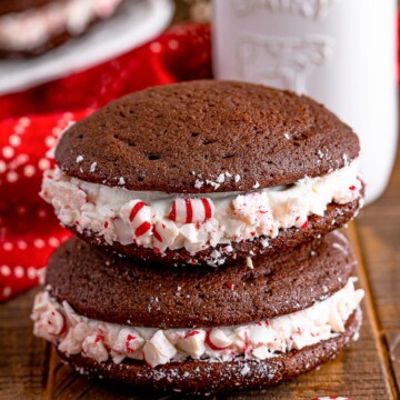 Freezer: You can freeze the unassembled cookies or the assembled whoopie pies without the crushed peppermints.
