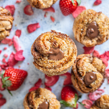 What makes this chocolate strawberry cruffins recipe extra decadent is the fact that I’m using the dough from my Lemon Berry Sweet Rolls. It is a Danish pastry dough that comes out perfectly flakey every time!