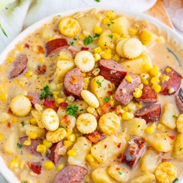 This Corn Chowder recipe is a rich, creamy soup packed with tender potatoes, crispy bacon, sweet corn, and smoky kielbasa.