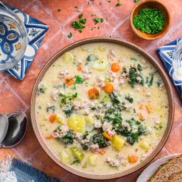 Tender Yukon Gold potatoes, ribbons of curly kale, and crumbles of sweet Italian sausage swim in a creamy chicken broth that tastes like a hug.