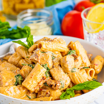 This Tuscan Chicken Pasta Recipe is so hearty and comforting. The rigatoni noodles really cling to the creamy sauce, and the sundried tomatoes and pesto add a wonderful, deep, rich flavor.