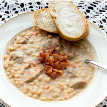 It’s finally getting a little colder, on and off here in Florida so to me that definitely means its officially soup weather, YAY! I love Love LOVE a good hot bowl of soup or stew with warm crusty bread with lots of butter, heaven! Today’s recipe doesn’t disappoint either! Creamy white bean and pork stew is very hearty and just gets better and better the longer it sits!