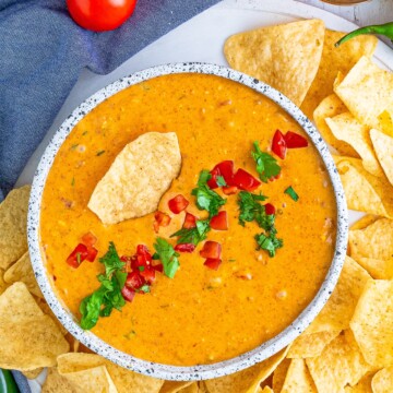 This easy substitution makes for a great recipe that still delivers an easy queso dip recipe perfect for your next party, super bowl party, or Cinco de Mayo celebration.