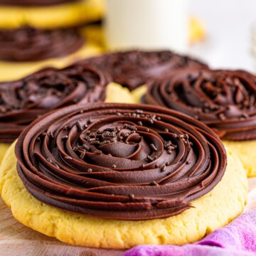 They taste like a vanilla cookie (with that subtle cake batter vibe) topped with a “hostess chocolate cupcake” style frosting.