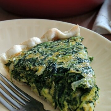 This Easy Cheddar & Spinach Quiche is one of my favorite quick meals to make. It can be served for breakfast, lunch or dinner and takes only a few minutes to prepare. It uses ingredients you probably already have on hand (no running to the grocery store) and can quickly be assembled. Chopped spinach is blended with eggs and Sharp Cheddar Cheese then baked in a pie crust for a tasty and filling meal that can be on your table in a little over 30 minutes. The buttery, flaky crust is delicious with the savory filling. I love to serve this with fresh fruit or even a salad.