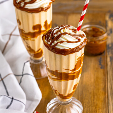 This milkshake recipe mixes vanilla ice cream, whipped cream, and dulce de leche—a gooey caramel goodness that’s the star of the show.