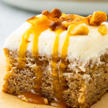 - Once the bars are cooled, spread the frosting over the top then sprinkle walnuts over the top.½ cup chopped walnuts