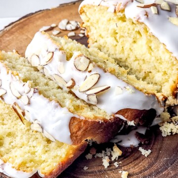 This isn’t just any loaf cake; it’s a moist, almond-flavored delight, drizzled with a sweet almond glaze and topped with crunchy sliced almonds.