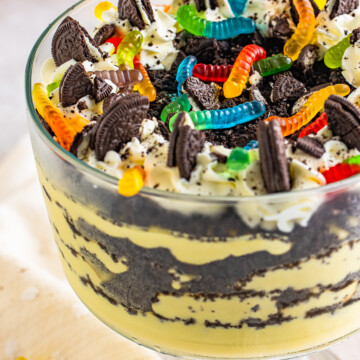 - When ready to serve, add gummi worms, whipped cream, and more cookie crumbs for garnish, optional.gummi worms for garnish, Whipped cream for garnish