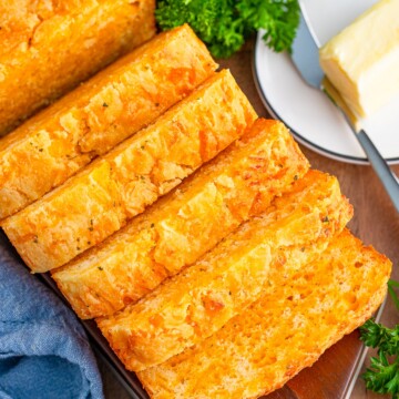 This Cheese Bread Recipe tastes just like Red Lobster’s Cheddar Bay Biscuits but in loaf form. Cheesy, with a buttery topping, and utterly irresistible!
