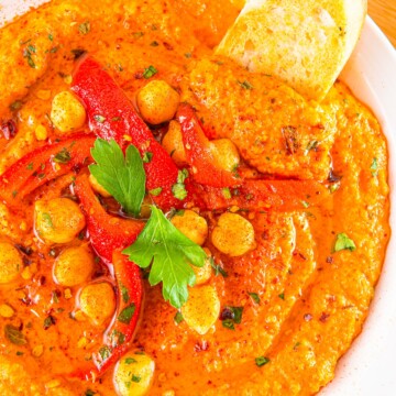 - Serve on a plate alongside some sliced of the reserved roasted bell peppers, olives, additional chickpeas, paprika, or your desired toppings.