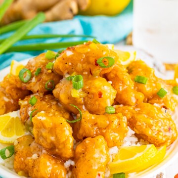 Asian Lemon Chicken: bite-sized pieces of crispy chicken coated in a tangy lemon sauce – sounds yummy, right? Well, add in green onions, garlic, and fresh ginger, and we’re really cooking!