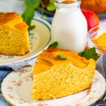 When the cake is flipped onto a serving plate, those sweet peaches are glossy and golden brown. Sounding delicious yet?