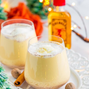 Fireball gives it that cinnamon kick, but you can also use whiskey, bourbon, rum, spiced rum, or any alcohol that complements eggnog.