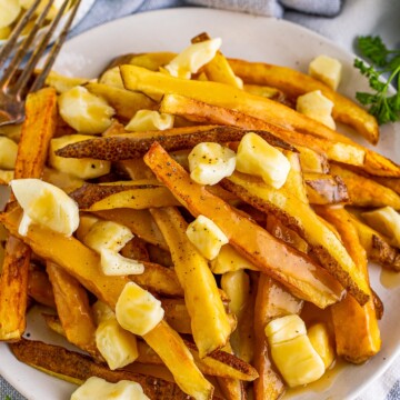 If you’ve never tried a poutine recipe before, it’s basically a dish made with three amazing ingredients: crispy french fries, squeaky cheese curds, and a savory gravy poured on top.