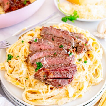 Garlicky alfredo sauce is the perfect match to a well seasoned steak. We’re talking about a flavorful dish that will have your guests humming in delight!