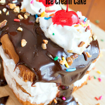 Hot Fudge Sundae Ice Cream Cake, layers of vanilla ice cream between pound cake, topped with classic sundae toppings!