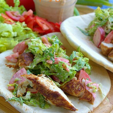 - Slice chicken and place in pita, top with lettuce mixture. You can add additional toppings as you wish. I suggest pepper jack cheese, cucumbers or red bell peppers. Serve and enjoy!