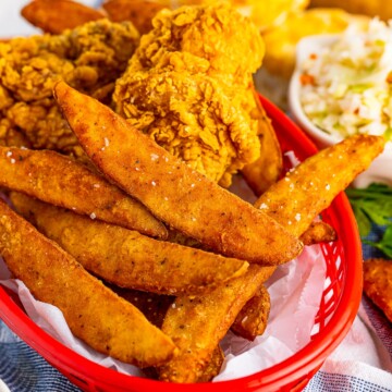 KFC wedge flavor is spot on.🤯 Decided to air fry fries so soaked for 30 minutes in ice cold water. Patted dry. Then followed recipe. Cooked at 435° for 20 mins, flipping halfway through. Also sprayed with oil before placing in airfryer. Next time I will fry them. Tasting these wedges reminded me how good KFC’s are, but these are so much butter. Thank you!!💌