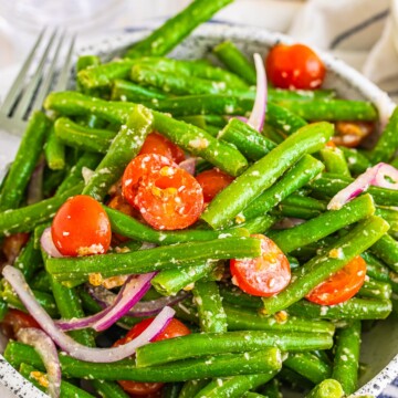 Perfect for any potluck, this String Bean Salad is marinated in a tangy homemade salad dressing. With the addition of cherry tomatoes and parmesan before serving, this is one flavorful side salad!
