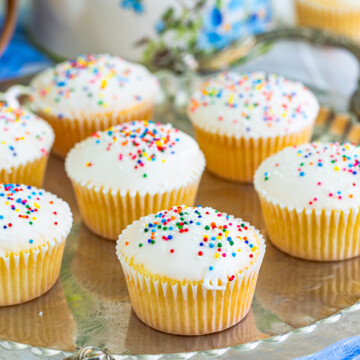 A fairy cake, also called a Queen Cake, is a small, light butter cake baked in cupcake liners, then topped with a thin glaze or a dusting of sugar instead of piled-high frosting.