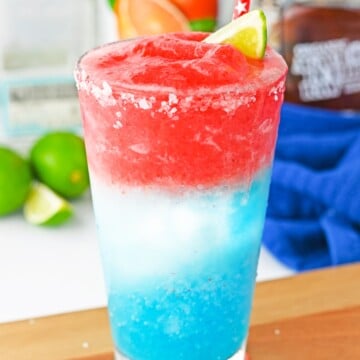 Each layer is a margarita, but they are all different flavors, how fun is that?! The red layer is strawberry, the white layer is coconut, and the blue layer is made with blue curaçao which has a nice orange flavor to it.