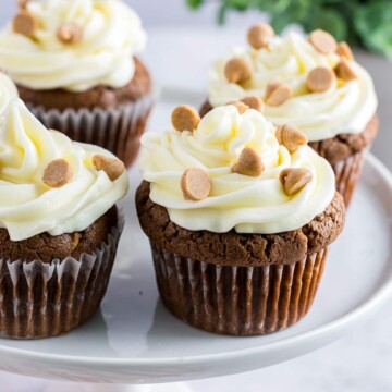 These aren’t just any cupcakes; they’re made with Reese’s Peanut Butter Chips and topped with a dreamy White Chocolate Frosting. These additions pair perfectly with my Simple Recipe for Chocolate Cupcakes.