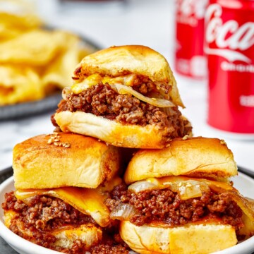 Sloppy Joe Sliders are the ultimate game day food. Sloppy joe meat on top of slider buns with melty cheese and Coca-Cola onions with a yummy glaze, all baked up until bubbly, it doesn’t get any better than this easy recipe!
