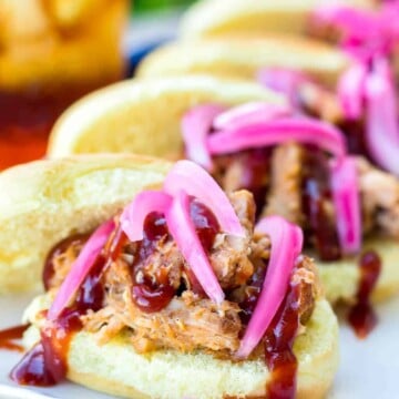 - Serve pulled pork on slider buns with more bbq sauce and pickled onions. Enjoy!