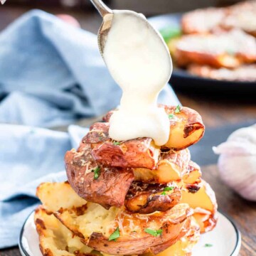 You can serve these parmesan smashed potatoes as-is or with the roasted garlic aioli recipe below. I highly recommend making the aioli to go with them!