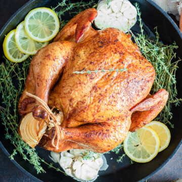 Always use a meat thermometer or instant-read thermometer to check the thickest part of the breast and thickest part of the thigh for an internal temperature of the chicken around 160-165°F.