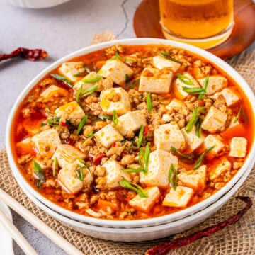 We’re talking silky tofu cubes swimming in a bright‑red, savory sauce pumped up with chili bean paste, a little ground pork, and a sprinkle of crackly Sichuan peppercorns.