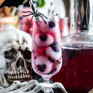 This incredible punch recipe is a showstopper. Imagine a table full of Halloween goodies and, in the center, a large punch bowl full of a fizzy, berry-flavored concoction with eerie ‘eyeballs’ floating around!