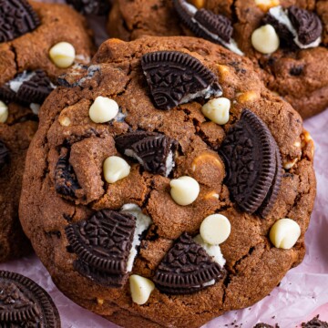 Cookies and Cream Cookies are made with a chocolate base cookie dough and stuffed with Oreo pieces and white chocolate chips. Jumbo cookies with no chill time, this is a must-make recipe!