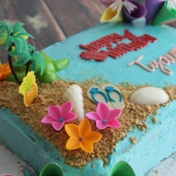 - choose one side of the cake to be the “beach” and sprinkle your graham crackers crumbs over that side and around the corners a bit to make the “sand.” Top cake with luau themed cake toppers and candy seashells.