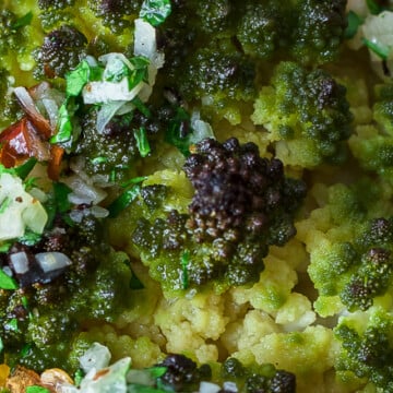 And, such a perfect side dish or even main course to serve during the holidays! That green from the cauliflower, the red from the red pepper flakes, can’t get enough!
